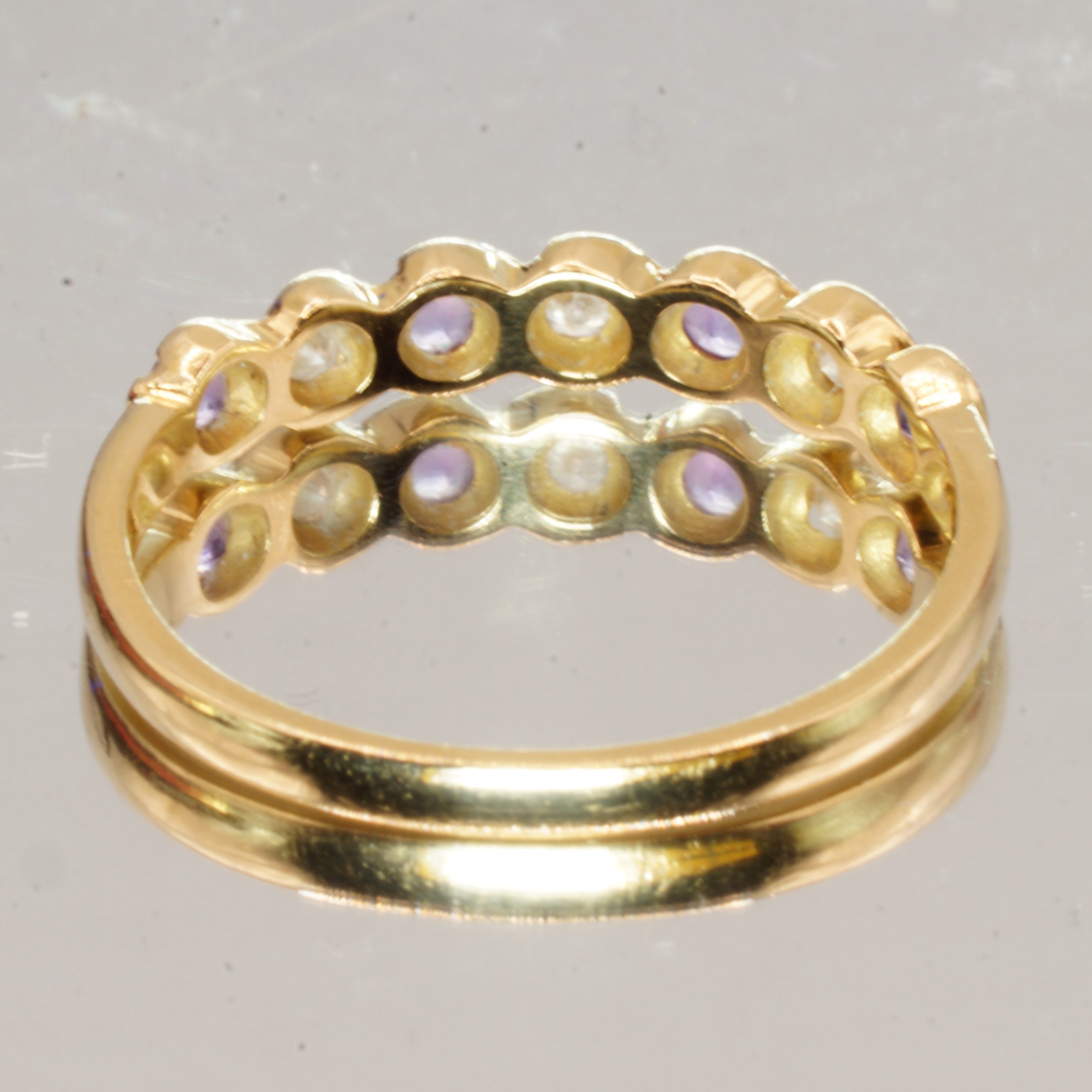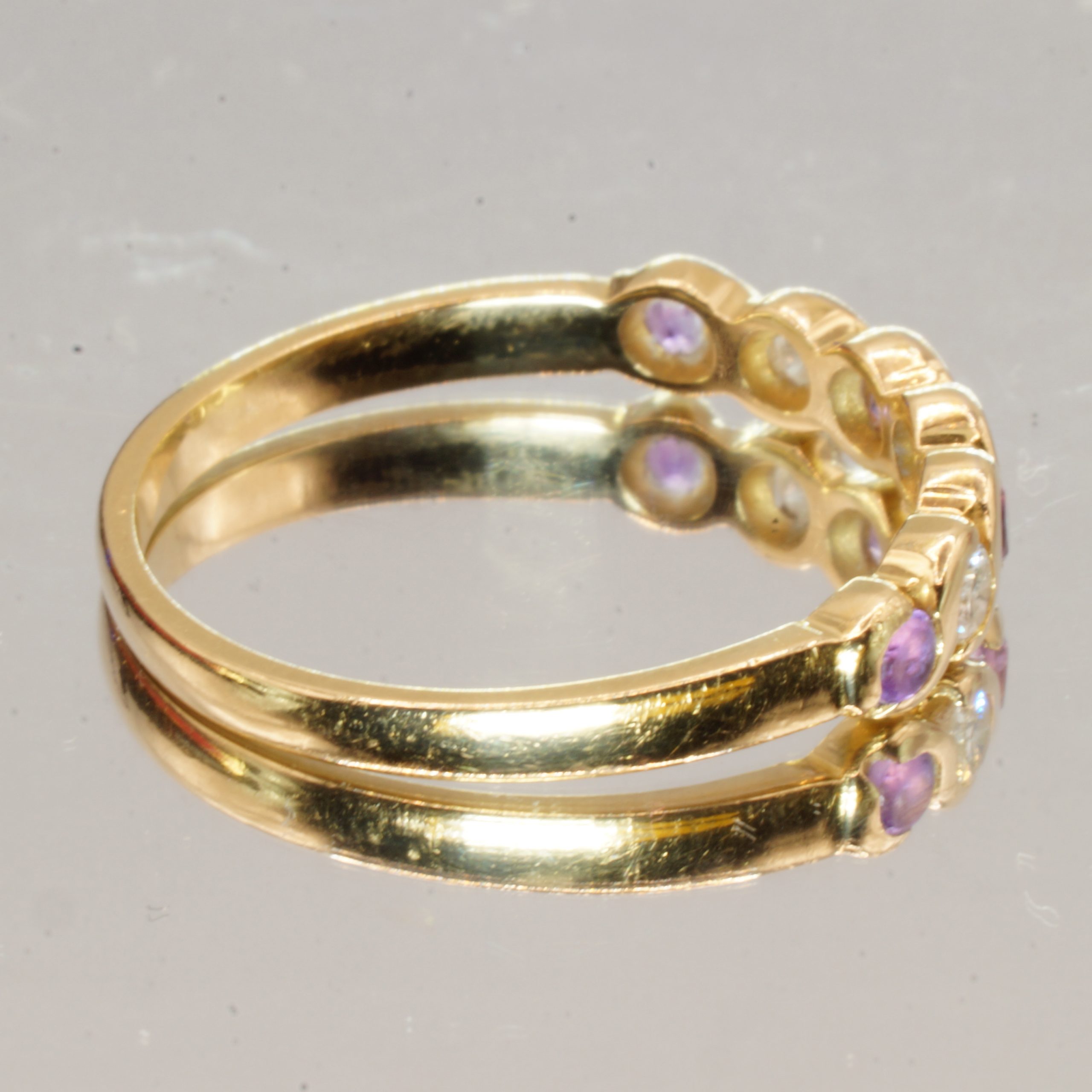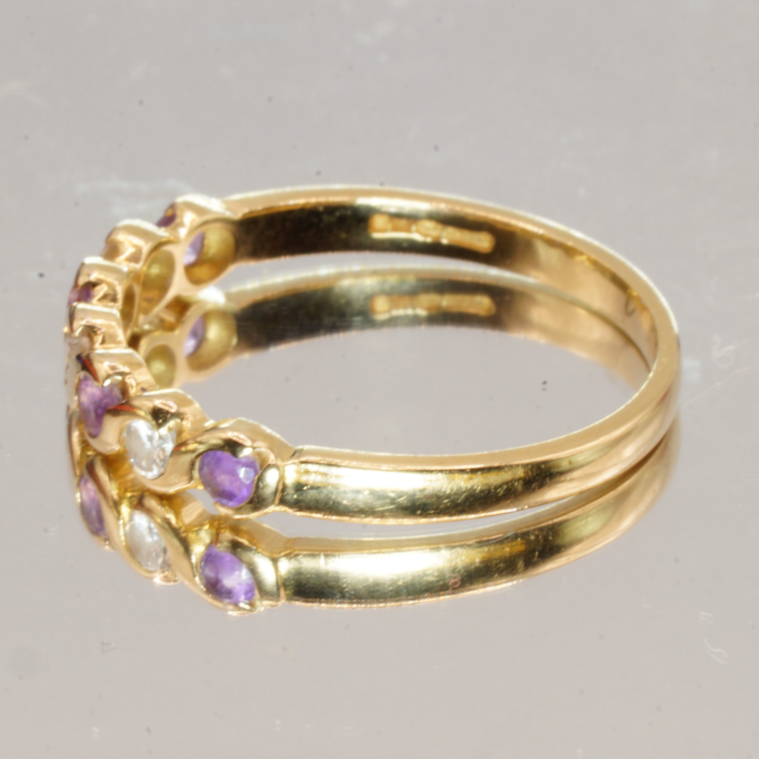 Elevate your jewellery collection with this stunning 18ct Yellow Gold half eternity ring, featuring a captivating purple amethyst and sparkling diamonds. This pre-owned piece, UK Size O, is perfect for stacking or wearing alone, making it a versatile addition to any outfit. It comes beautifully presented in a luxurious velvet box, making it an ideal gift for a loved one or a special treat for yourself. Embrace elegance and sophistication with this exquisite hallmark ring that combines timeless design with vibrant colour.