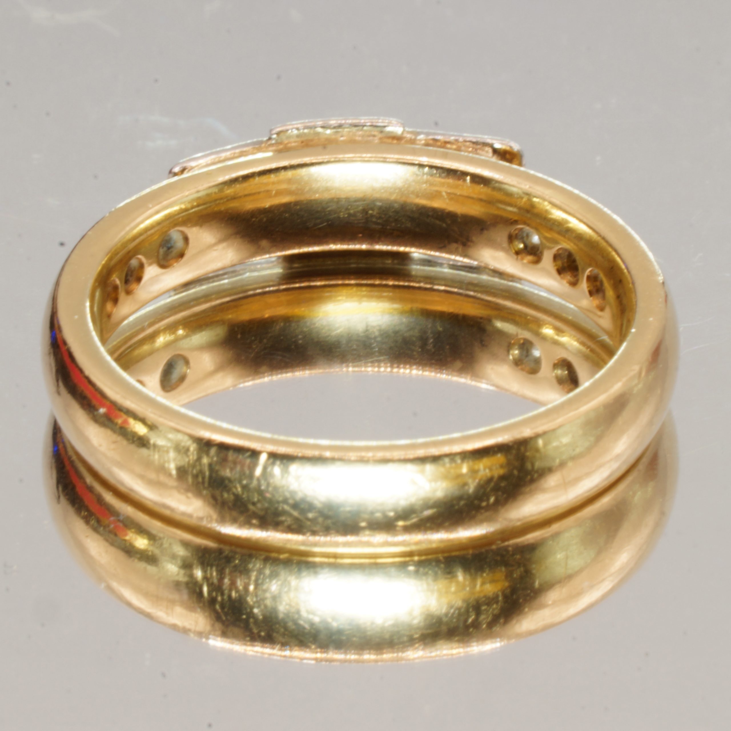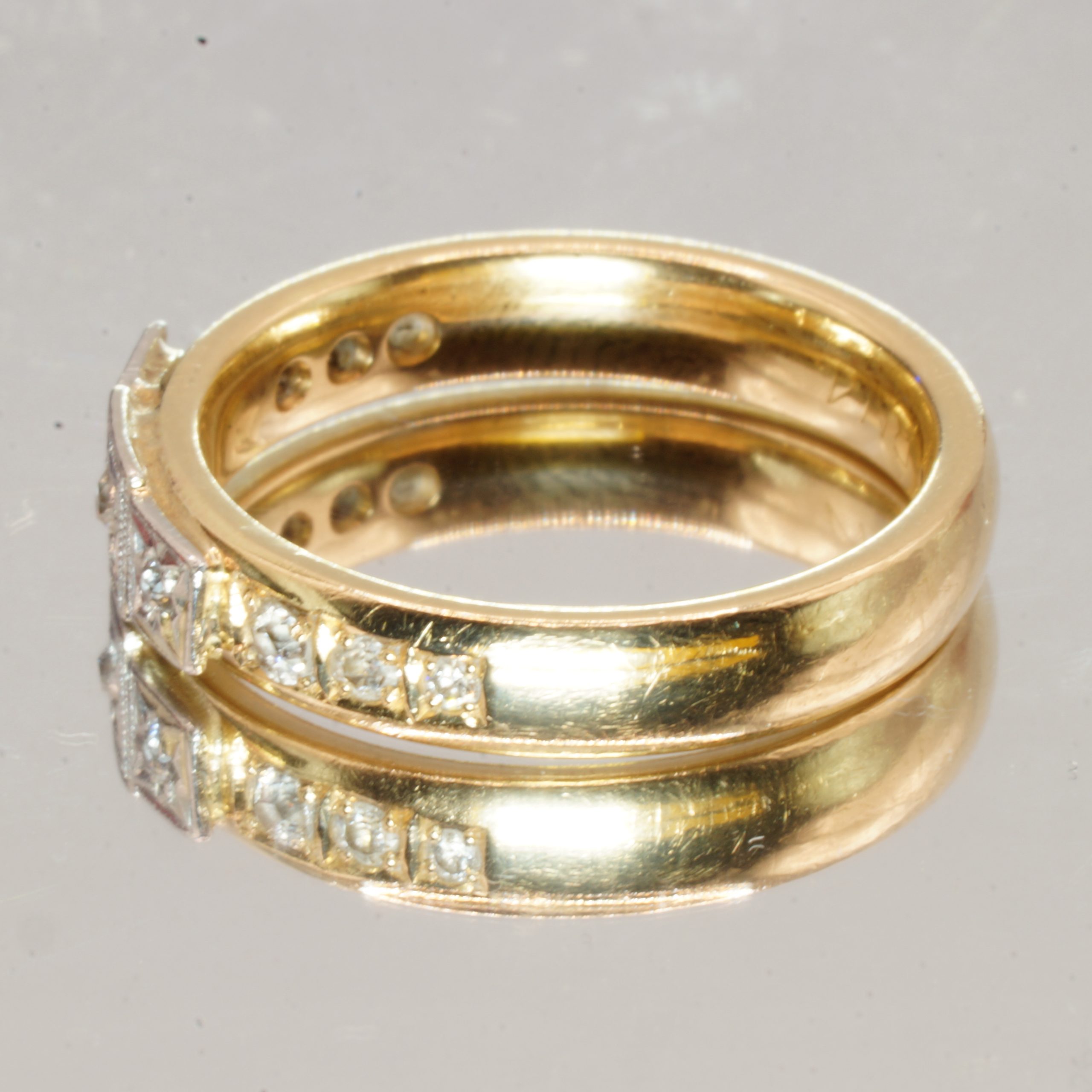 Elevate your jewellery collection with this exquisite 18ct Yellow Gold chunky hallmark belt-style ring, adorned with sparkling diamonds. This pre-owned UK Size O1/2 ring is perfect for stacking or wearing solo, making it a versatile addition to any outfit. Presented in a luxurious velvet box, it makes an ideal gift for a loved one or a special treat for yourself. Embrace elegance and sophistication with this timeless piece that effortlessly combines style and quality.