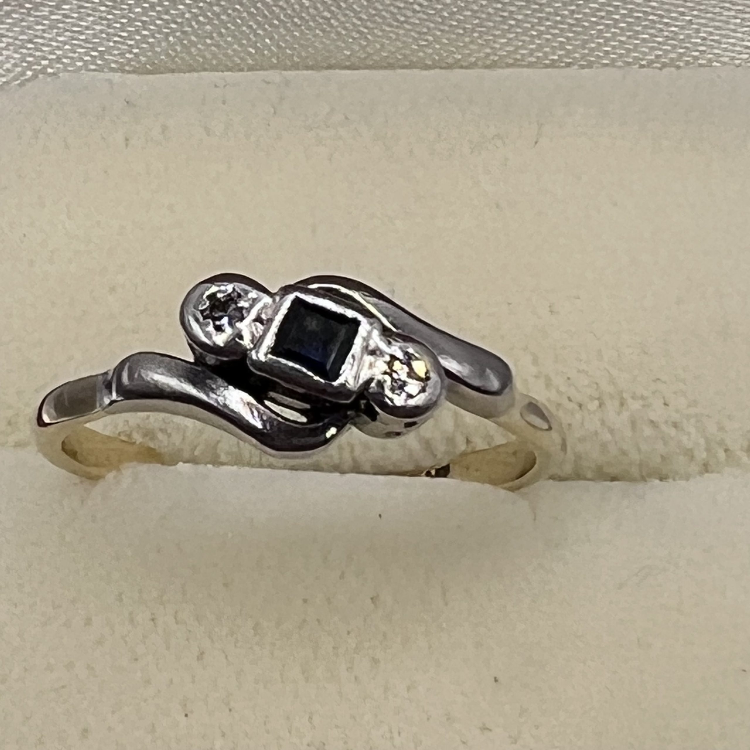 Discover the timeless elegance of this exquisite 18ct yellow gold crossover trilogy ring, featuring a stunning blue sapphire and sparkling diamonds. This pre-owned, pre-loved piece is a perfect choice for an engagement ring or a meaningful gift, beautifully presented in a luxurious black velvet box. With its unique design and UK size 0, this stacking ring not only showcases your style but also carries a hallmark of quality, making it a cherished addition to any jewellery collection.