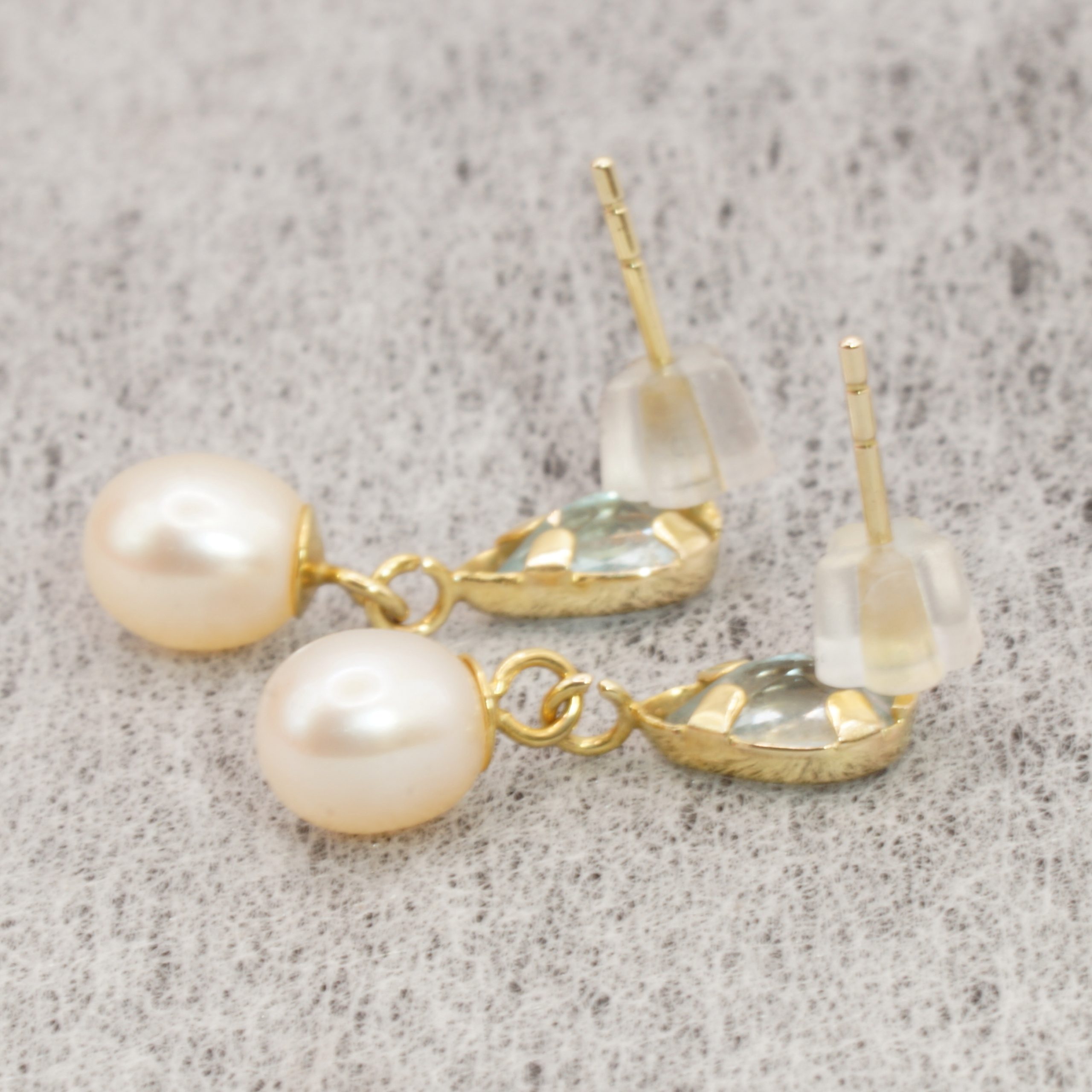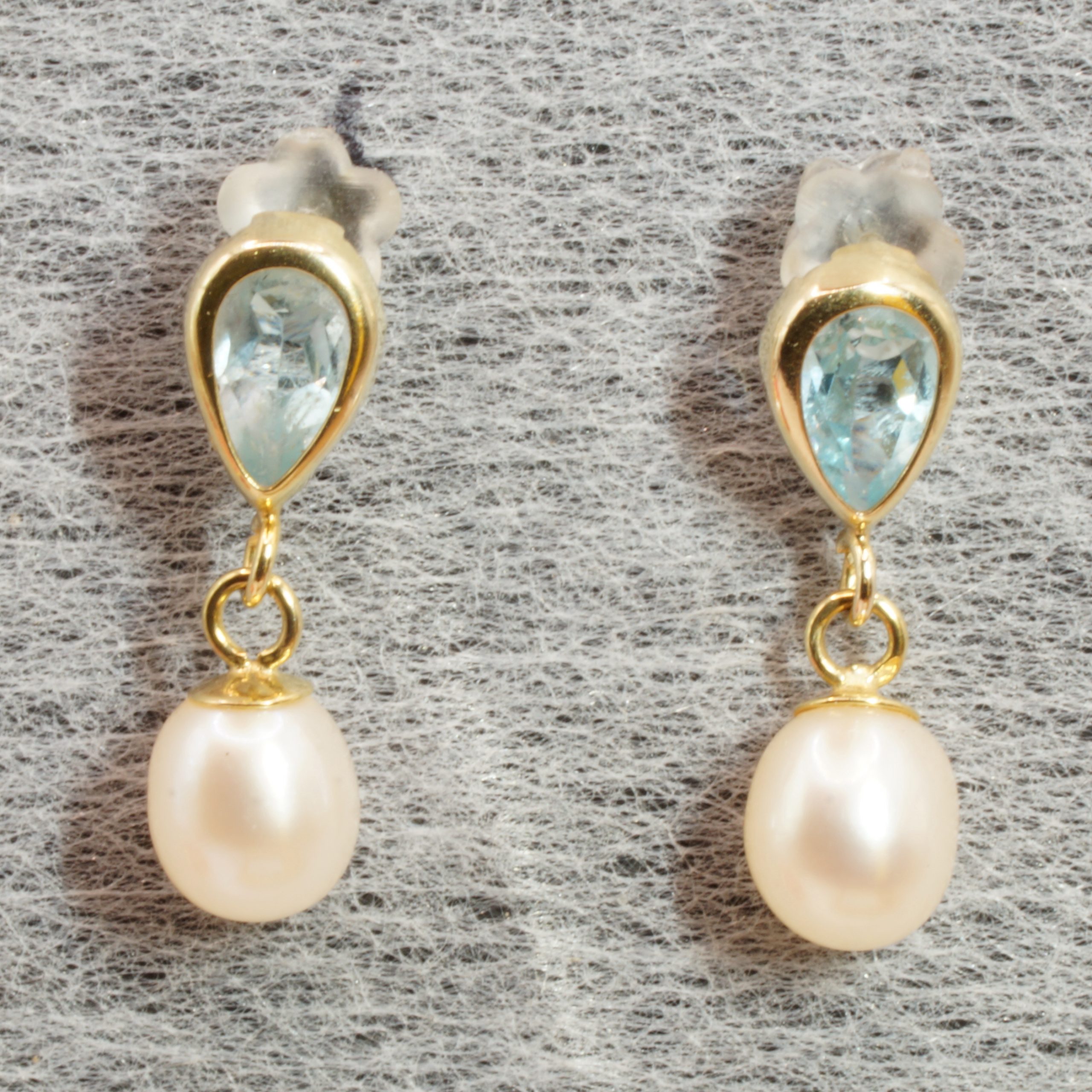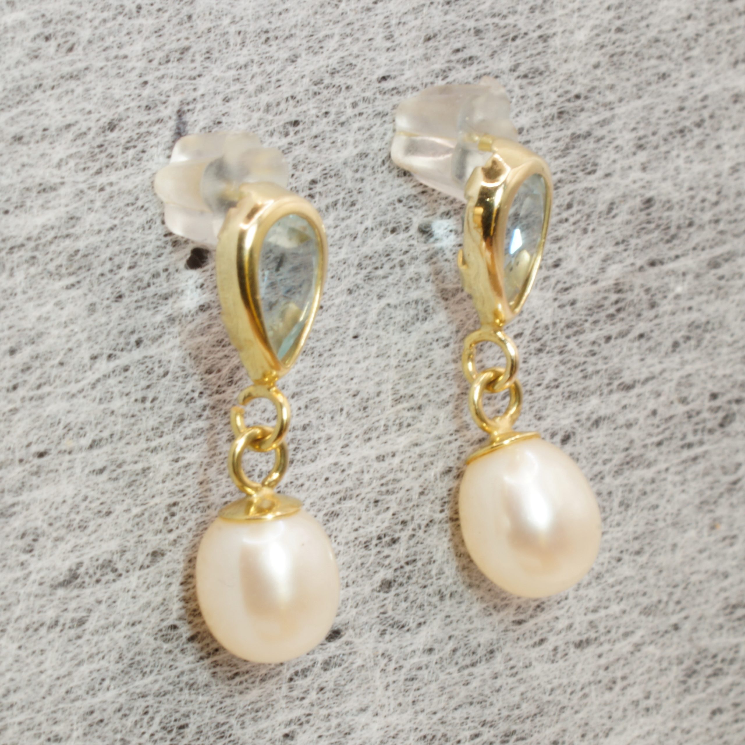 Elevate your jewellery collection with these exquisite 9ct yellow gold aquamarine and pearl drop dangle earrings. Designed for pierced ears, these stunning earrings feature a graceful 17mm drop, showcasing the serene beauty of aquamarine complemented by lustrous pearls. Each piece is hallmarked for authenticity and secured with a reliable pushback closure, ensuring comfort and ease of wear. Pre-owned yet in excellent condition, they come beautifully presented in a gift box, making them the perfect choice for a special occasion or a thoughtful gift for a loved one.