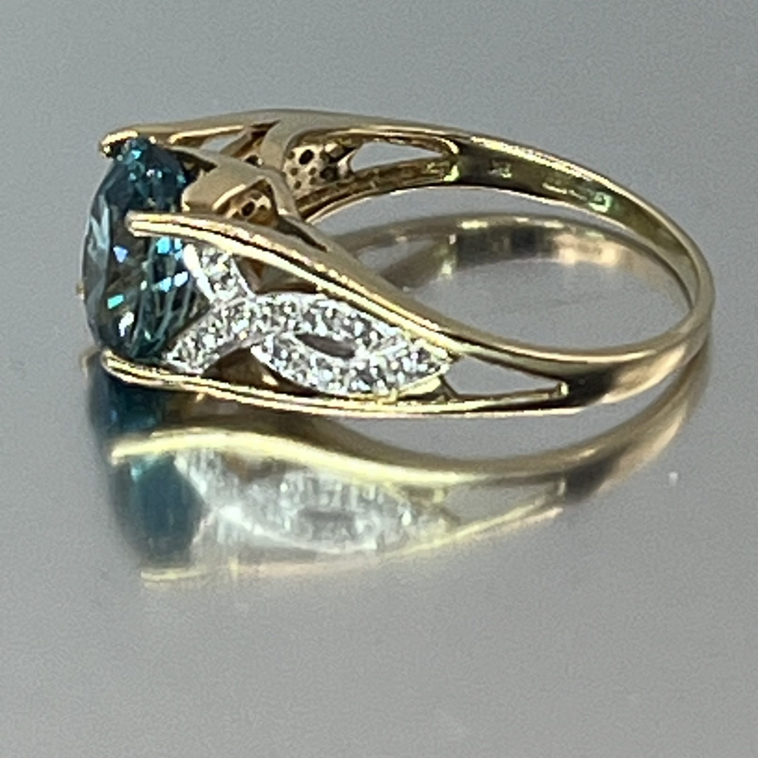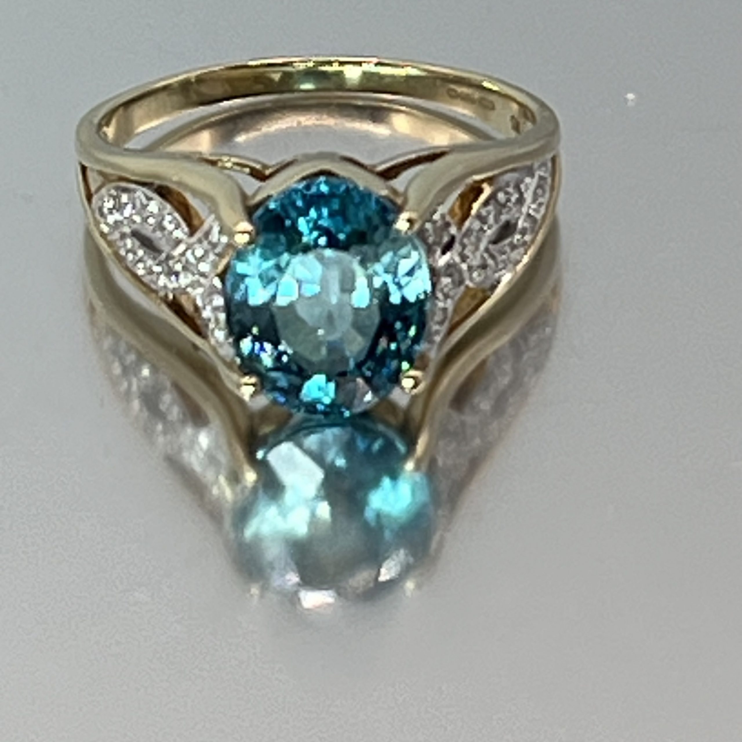 Discover the timeless elegance of this exquisite 9ct yellow gold ring, featuring a stunning blue topaz centerpiece complemented by sparkling diamond shoulders. Perfect as a stacking or engagement ring, this pre-owned treasure is hallmarked for authenticity and comes in a luxurious black velvet presentation box, making it an ideal gift for a loved one. With a UK size of M1/2, this pre-loved piece combines beauty and sentiment, ensuring it will be cherished for years to come.