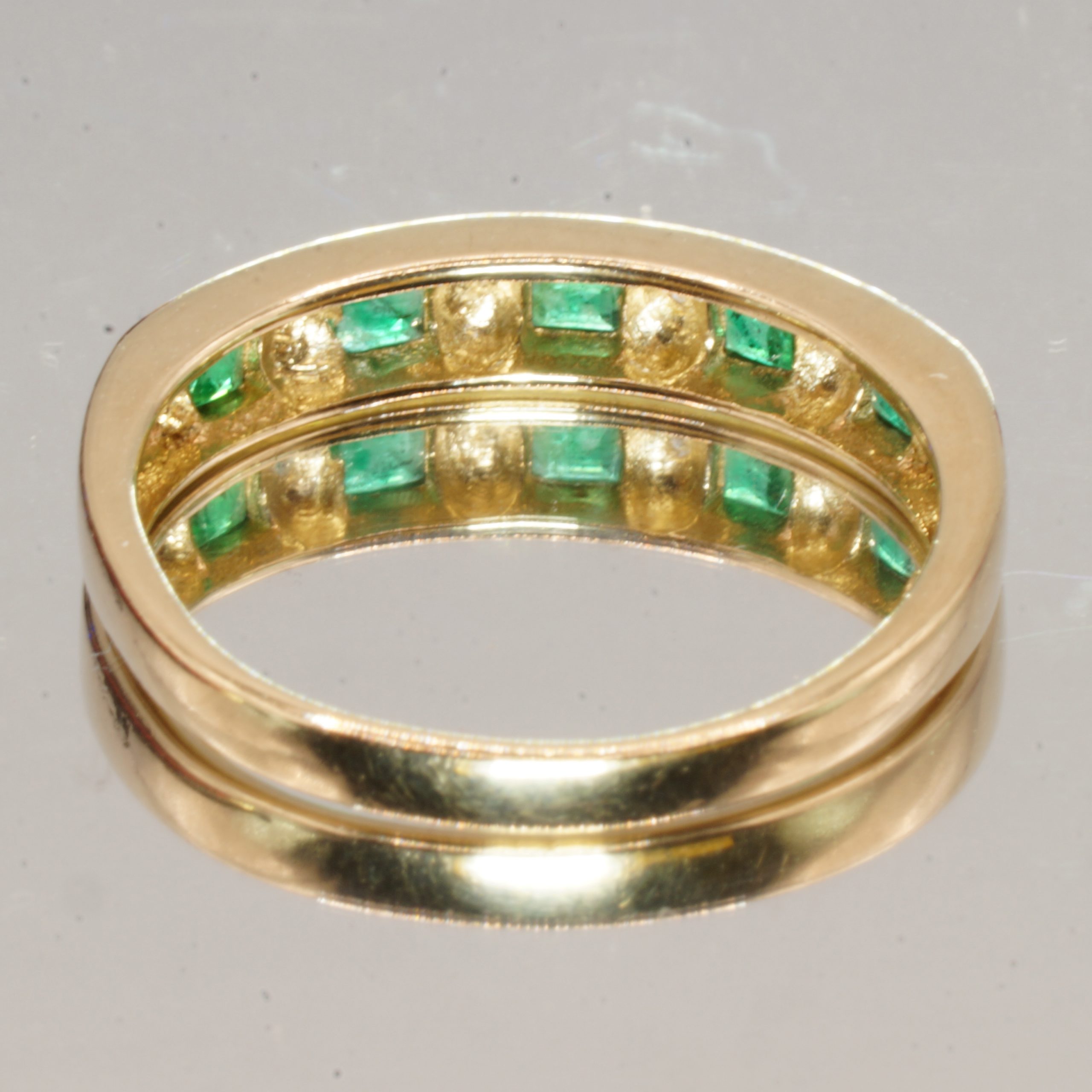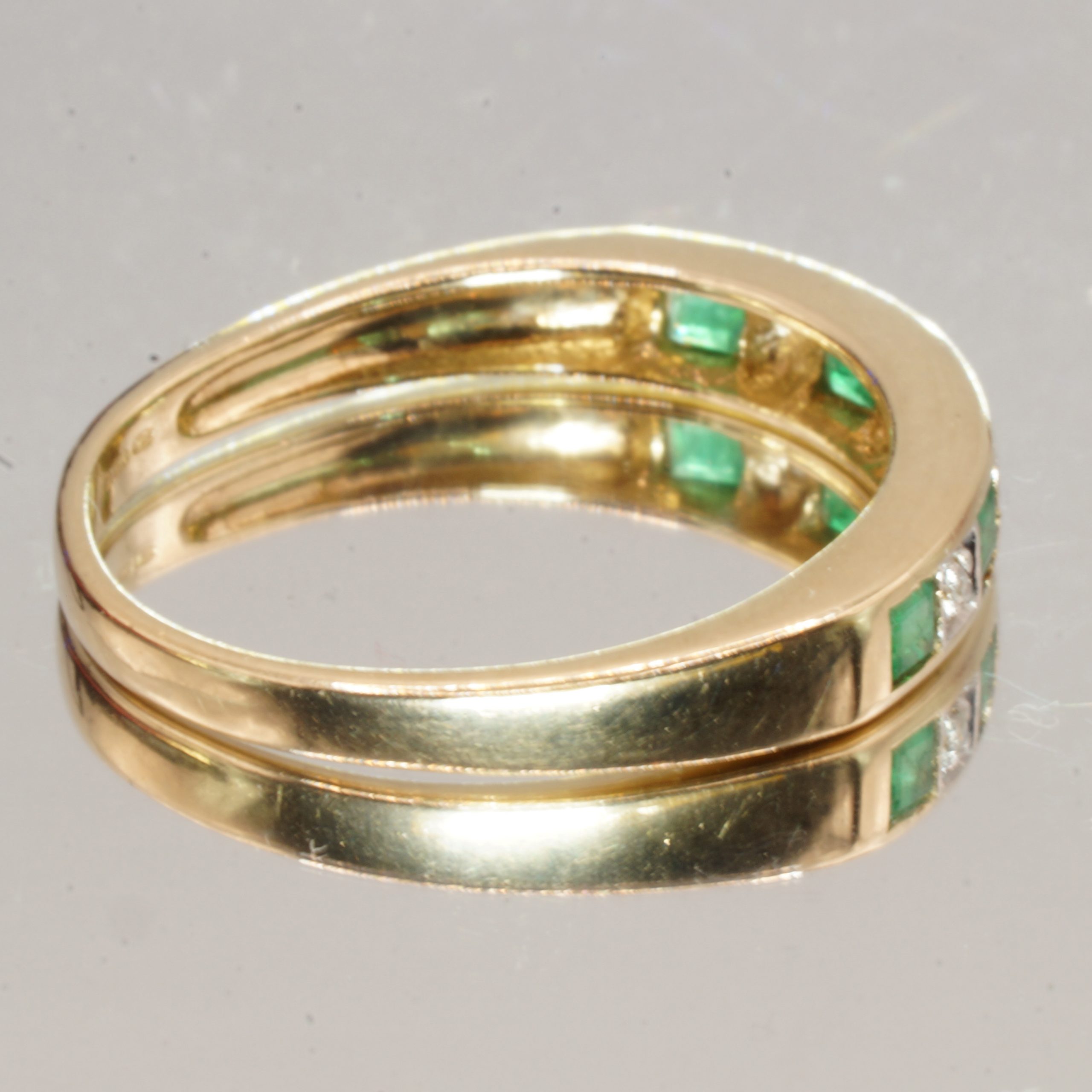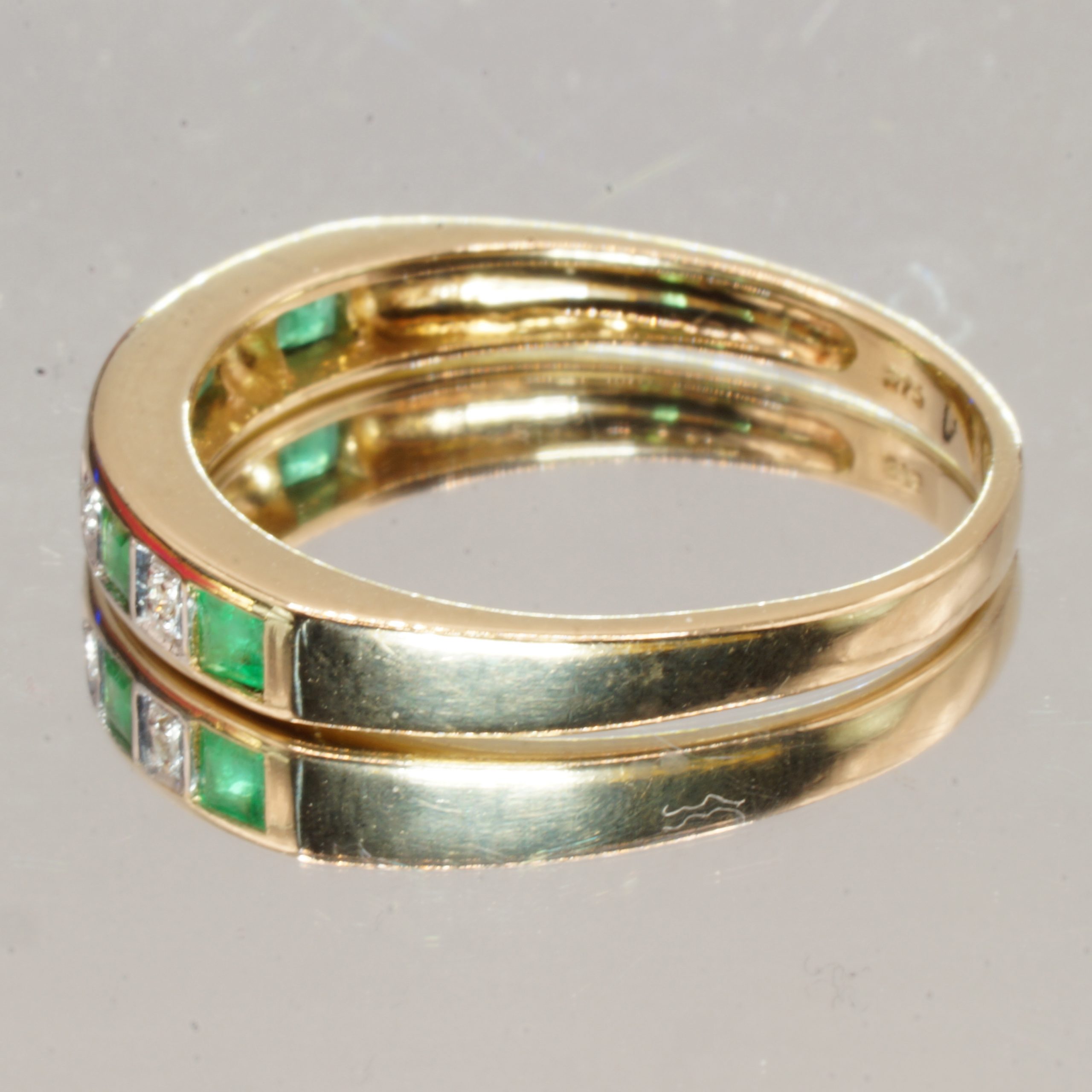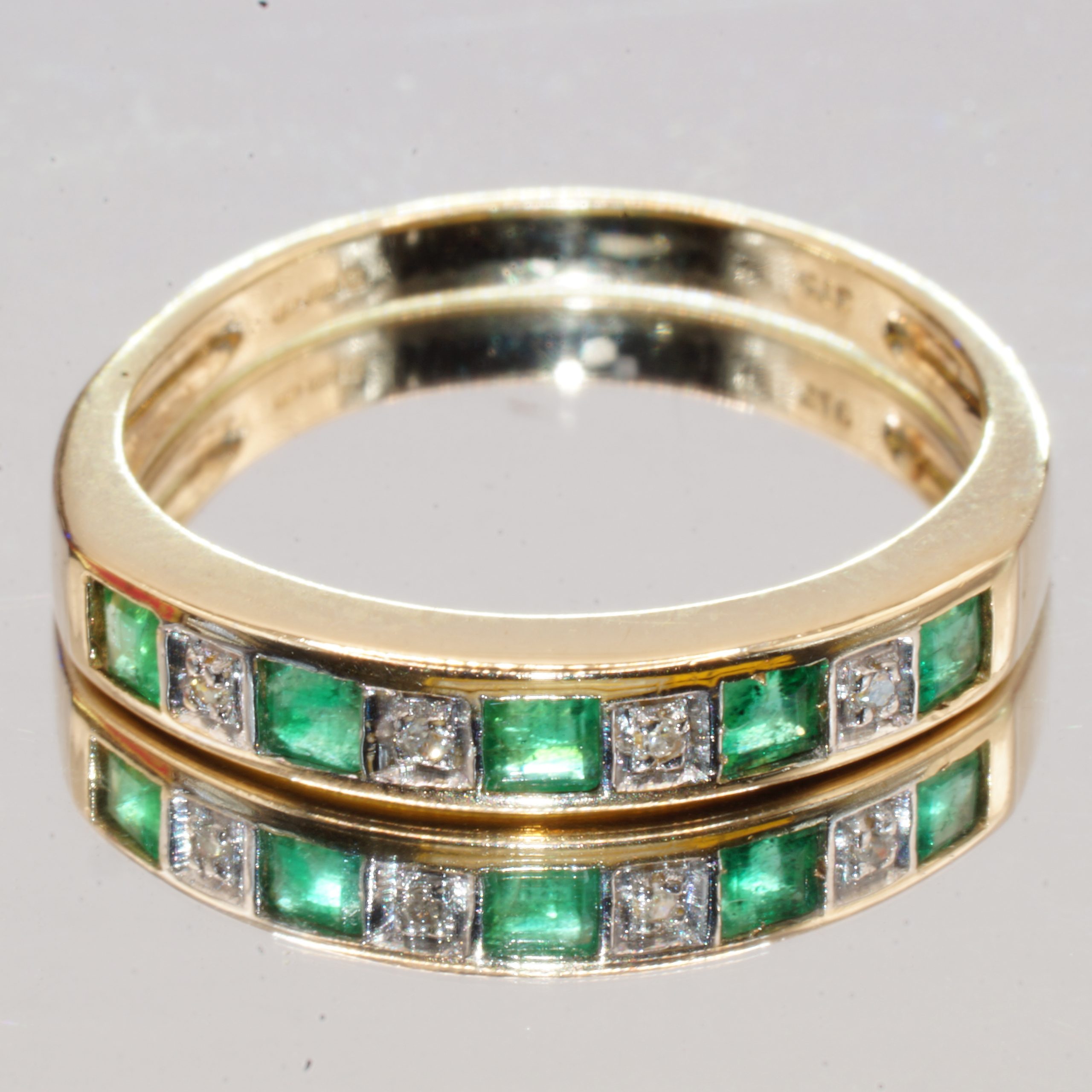 Discover the timeless elegance of this exquisite 9ct Yellow Gold half eternity ring, adorned with stunning emeralds and sparkling diamonds. Perfect for stacking or as a standalone piece, this pre-owned ring showcases a beautiful hallmark, ensuring its quality and authenticity. Presented in a luxurious velvet box, it makes an ideal gift for a loved one or a special treat for yourself. Available in UK Size N, this ring is a captivating addition to any jewellery collection.