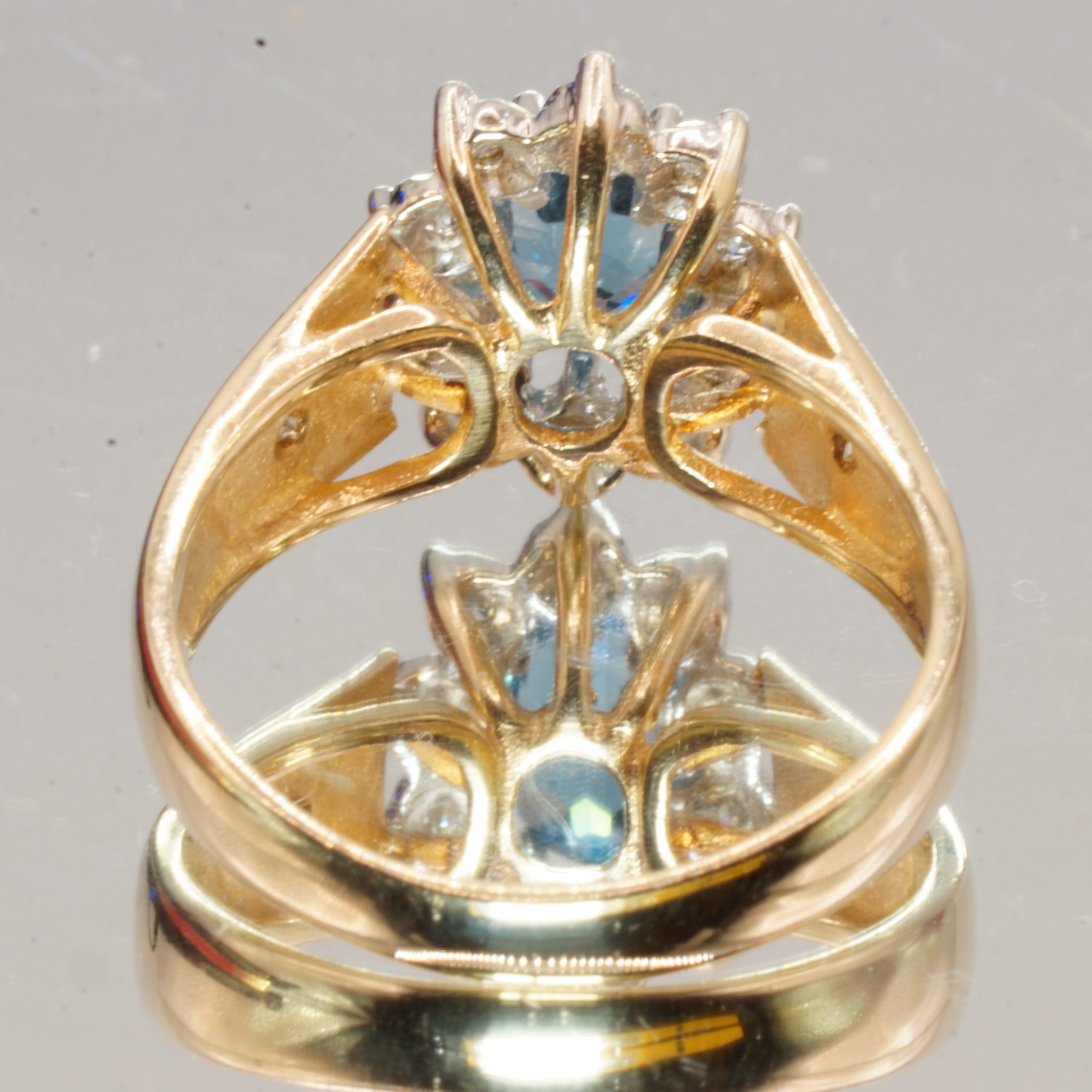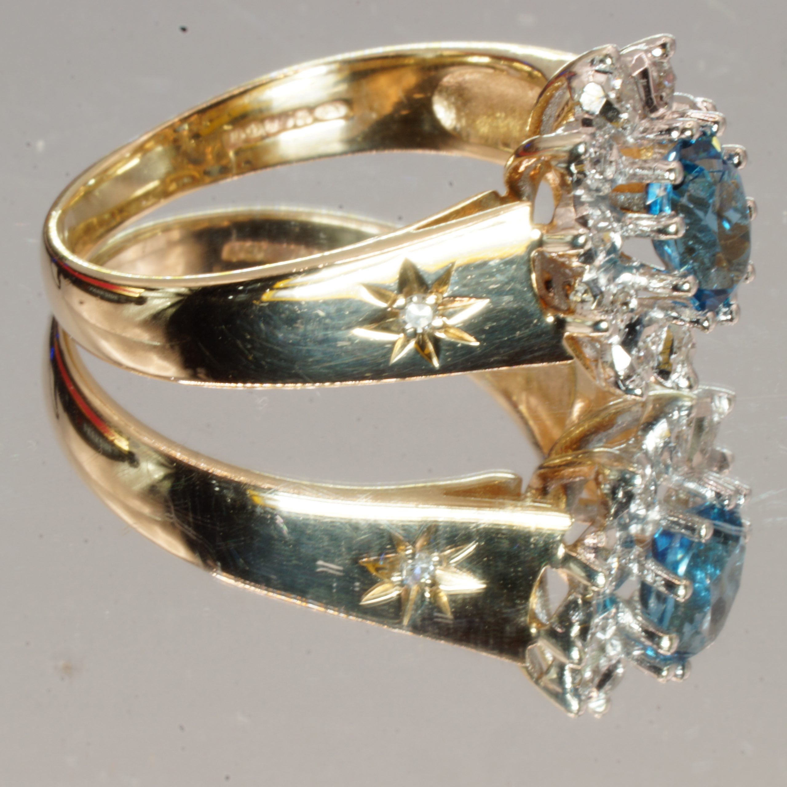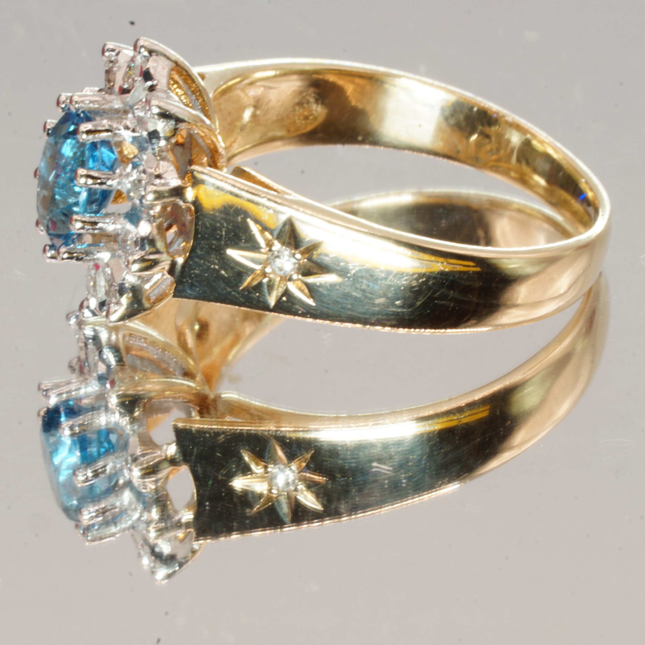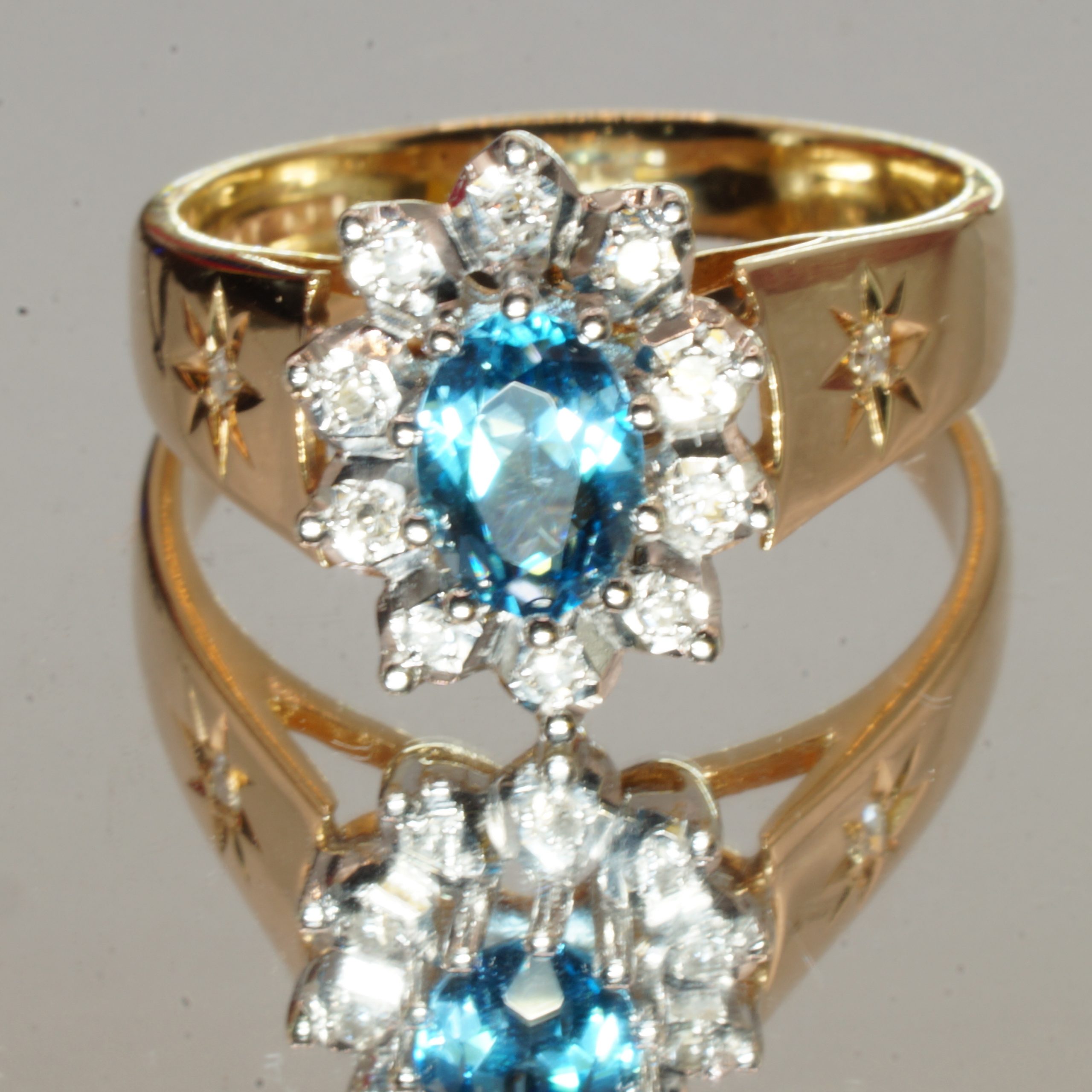 Discover the elegance of this exquisite 9ct yellow gold engagement ring, a stunning piece that beautifully combines classic charm with modern sophistication. Featuring a captivating blue indigolite at its center, this halo ring is adorned with sparkling diamonds also small diamonds on the shoulders, adding a touch of brilliance to its design. Perfect for stacking or as a stand alone statement, this pre-owned ring comes in a UK size 01/2 and is presented in a luxurious velvet box, making it an ideal gift for that special someone. Embrace the timeless allure of real gold and make a memorable impression with this enchanting piece of jewellery.