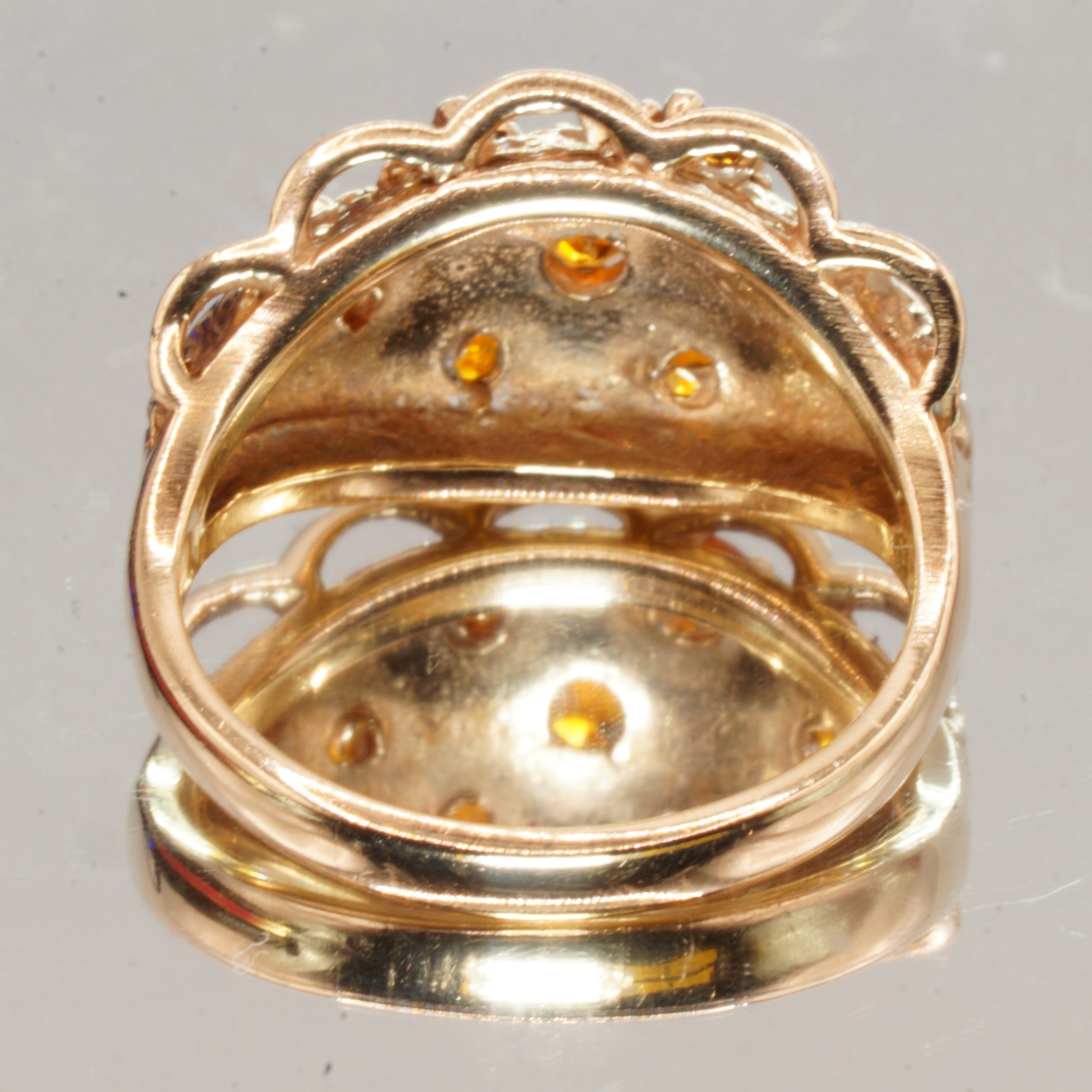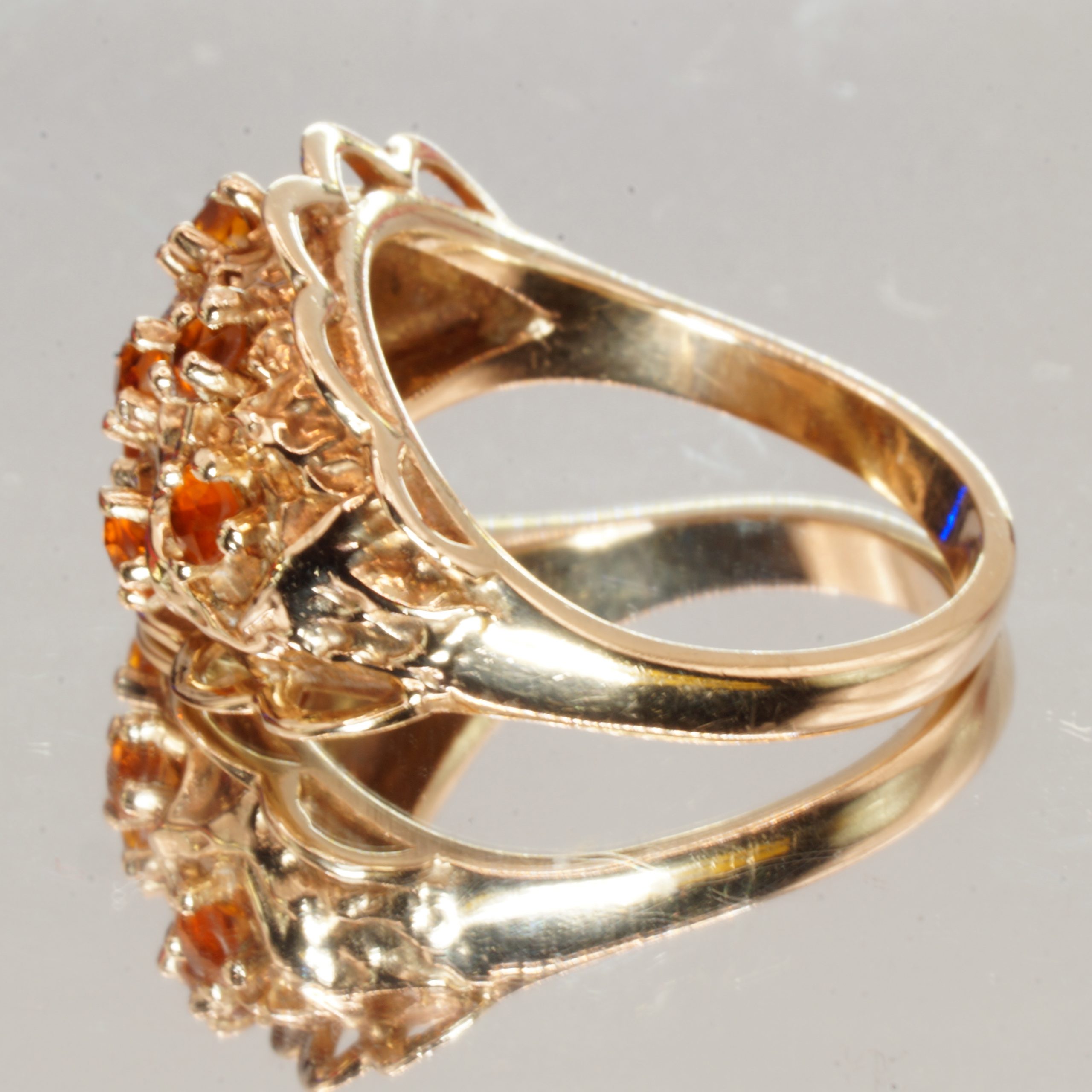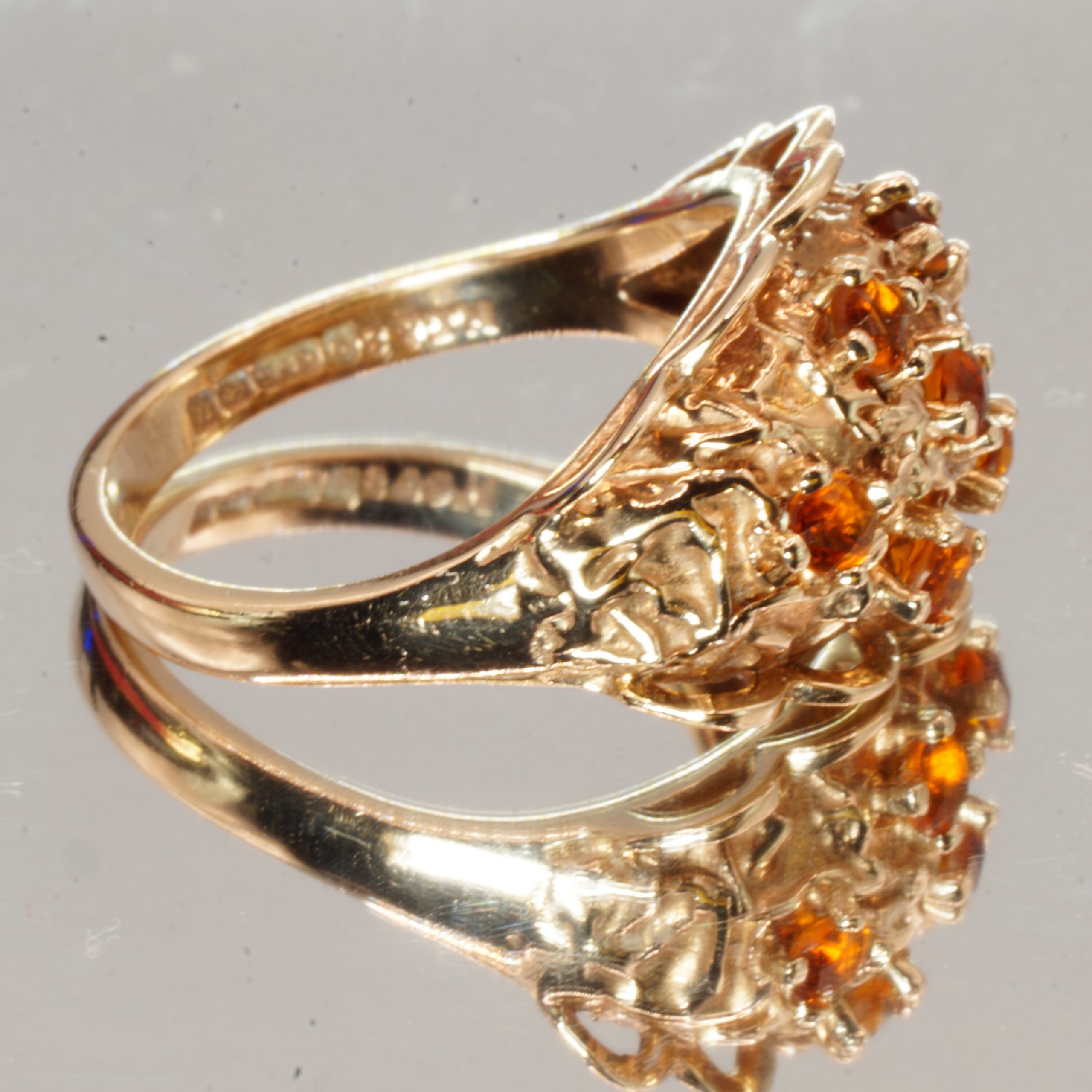 Elevate your jewellery collection with this exquisite 9ct yellow gold cocktail ring, featuring stunning orange sapphires that radiate warmth and elegance. This pre-owned piece, UK size M1/2, is hallmarked for authenticity and comes beautifully presented in a luxurious velvet box, making it an ideal gift for a loved one or a special treat for yourself. Embrace the allure of this unique ring and make a statement at any occasion.