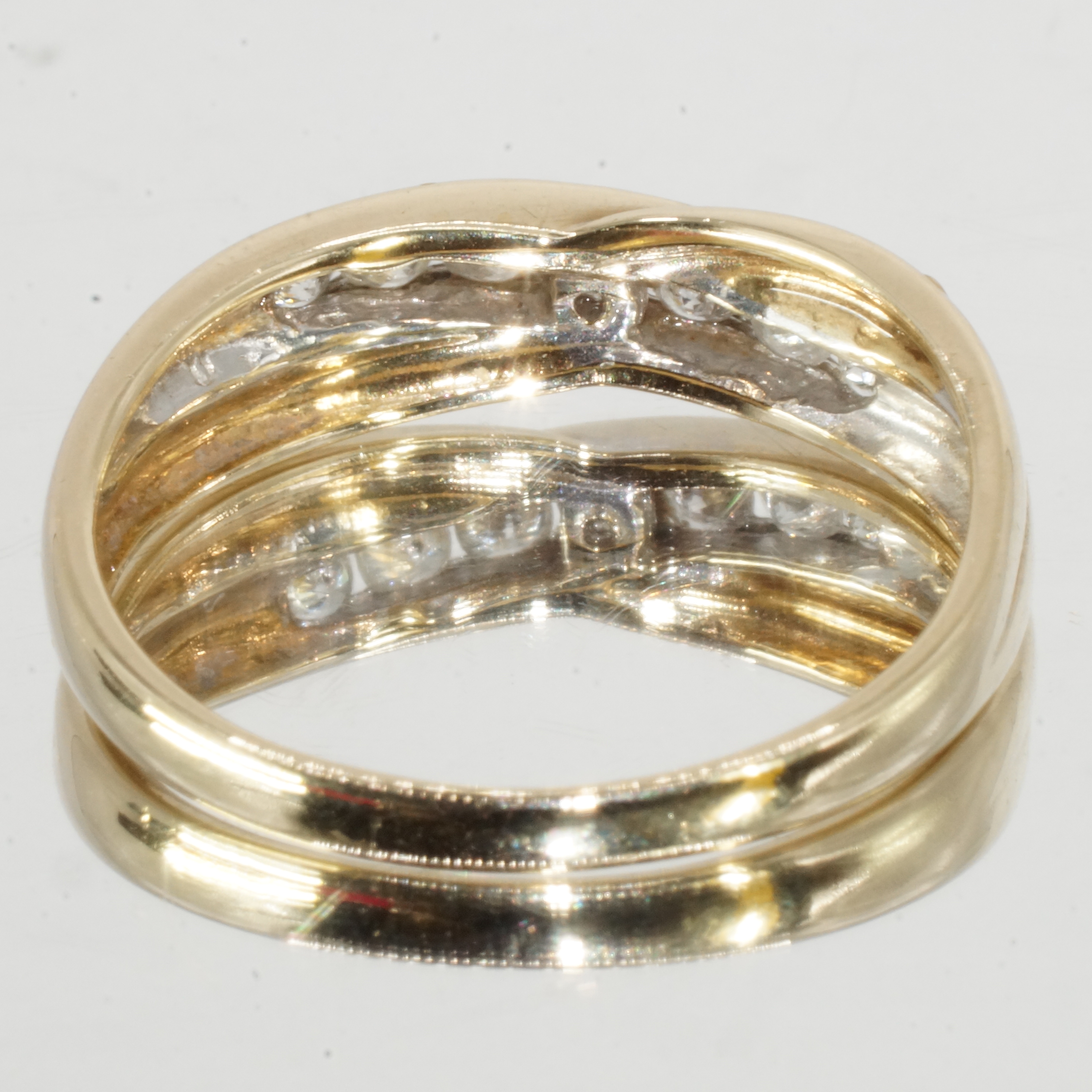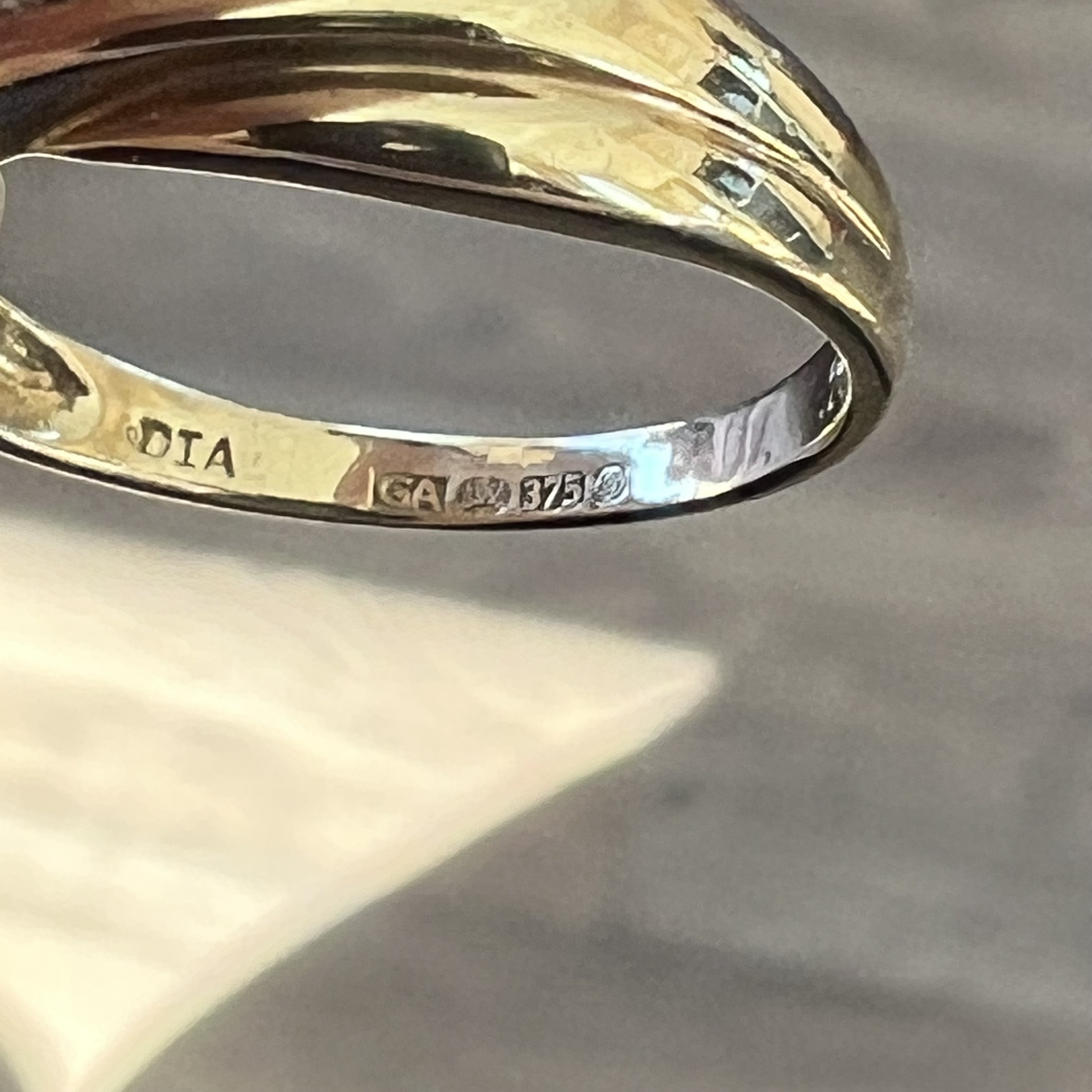 Elevate your jewellery collection with this exquisite 9ct Yellow Gold crossover style stacking ring, adorned with 1/4 (0.25) carat of 8 natural diamonds. This pre-owned piece, featuring a hallmark for authenticity, is a stunning addition to any ensemble, perfect for both everyday wear and special occasions. Sized at UK Size N, it comes beautifully presented in a box, making it an ideal gift for a loved one or a luxurious treat for yourself. Embrace elegance and sophistication with this timeless ring that effortlessly combines style and sparkle.