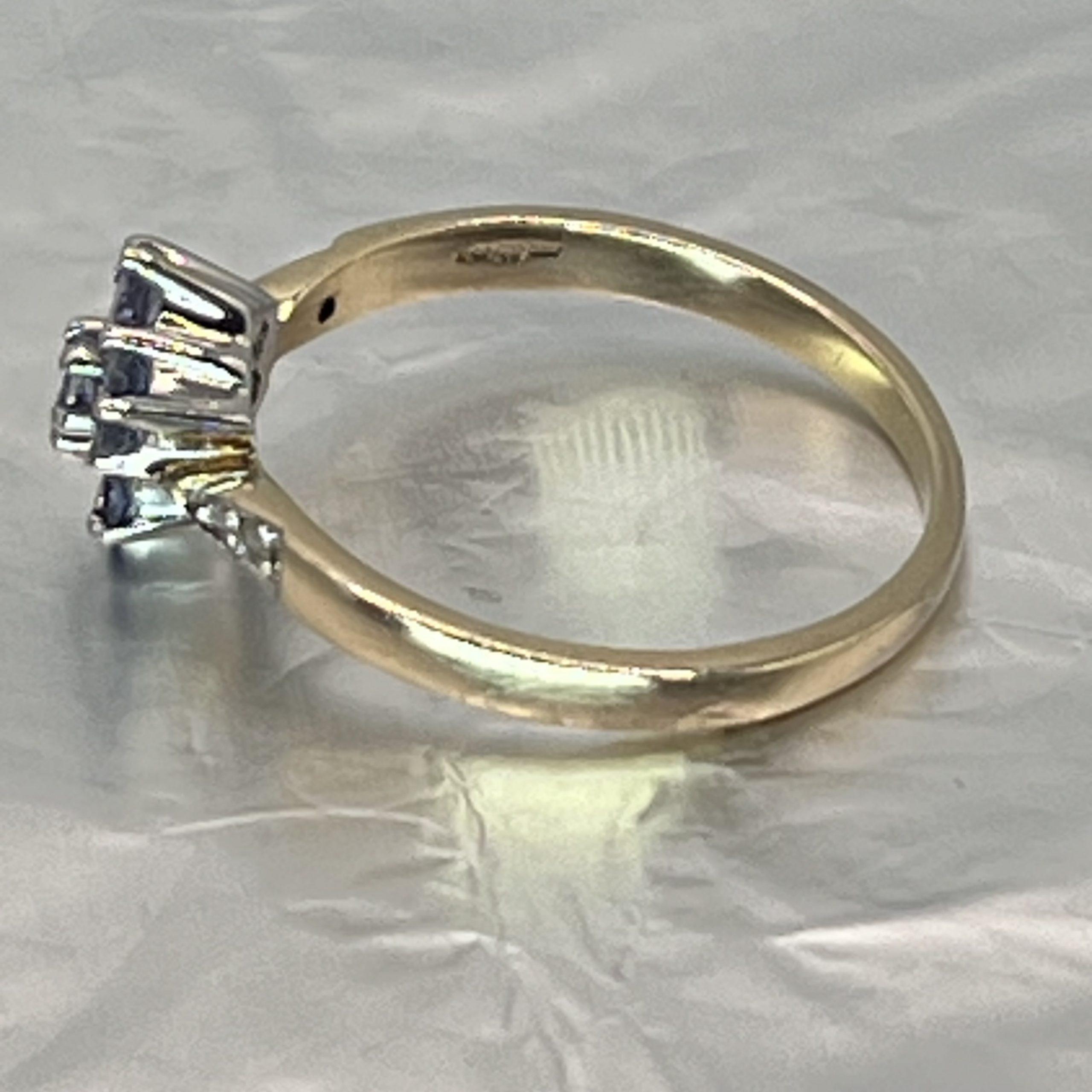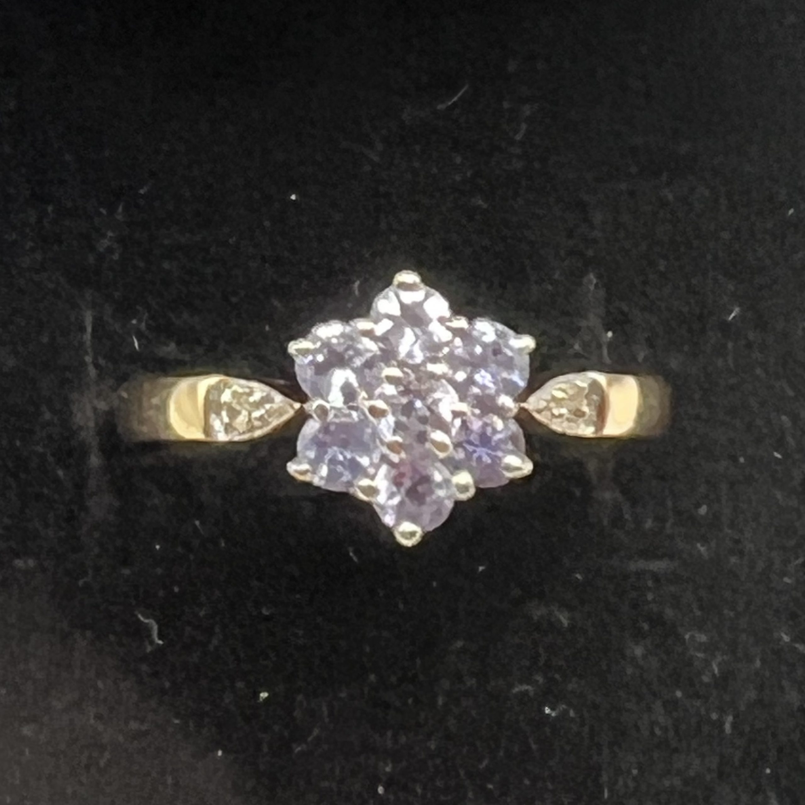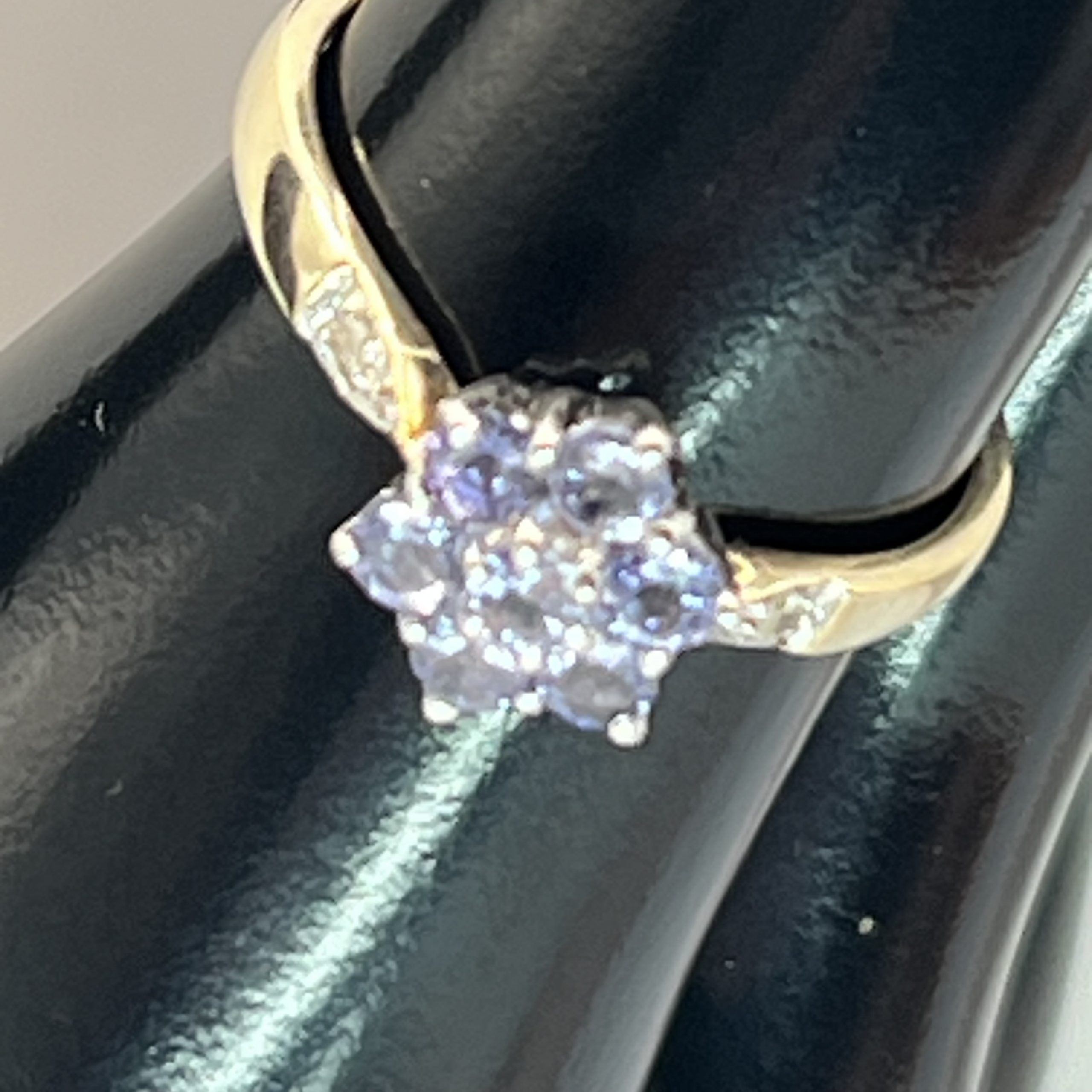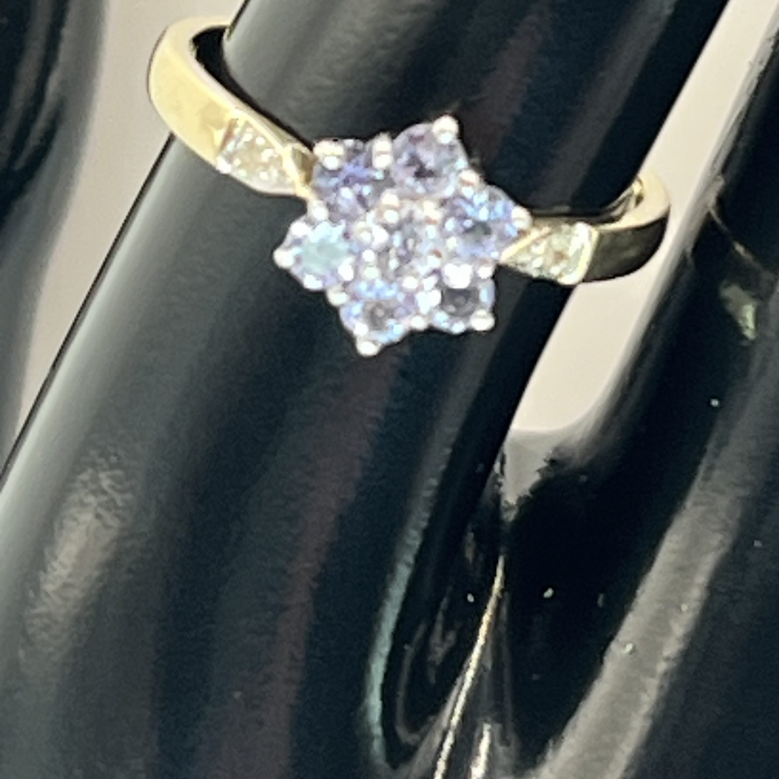 Discover the elegance of this exquisite 9ct yellow gold stacking ring, featuring a stunning tanzanite cluster set in a secure prong setting. Adorned with sparkling diamond shoulders, this pre-owned engagement ring is a true statement piece, perfect for marking special occasions. With a hallmark ensuring its quality, this UK Size P ring comes beautifully presented in a luxurious velvet box, making it an ideal gift for a loved one or a cherished addition to your own collection.