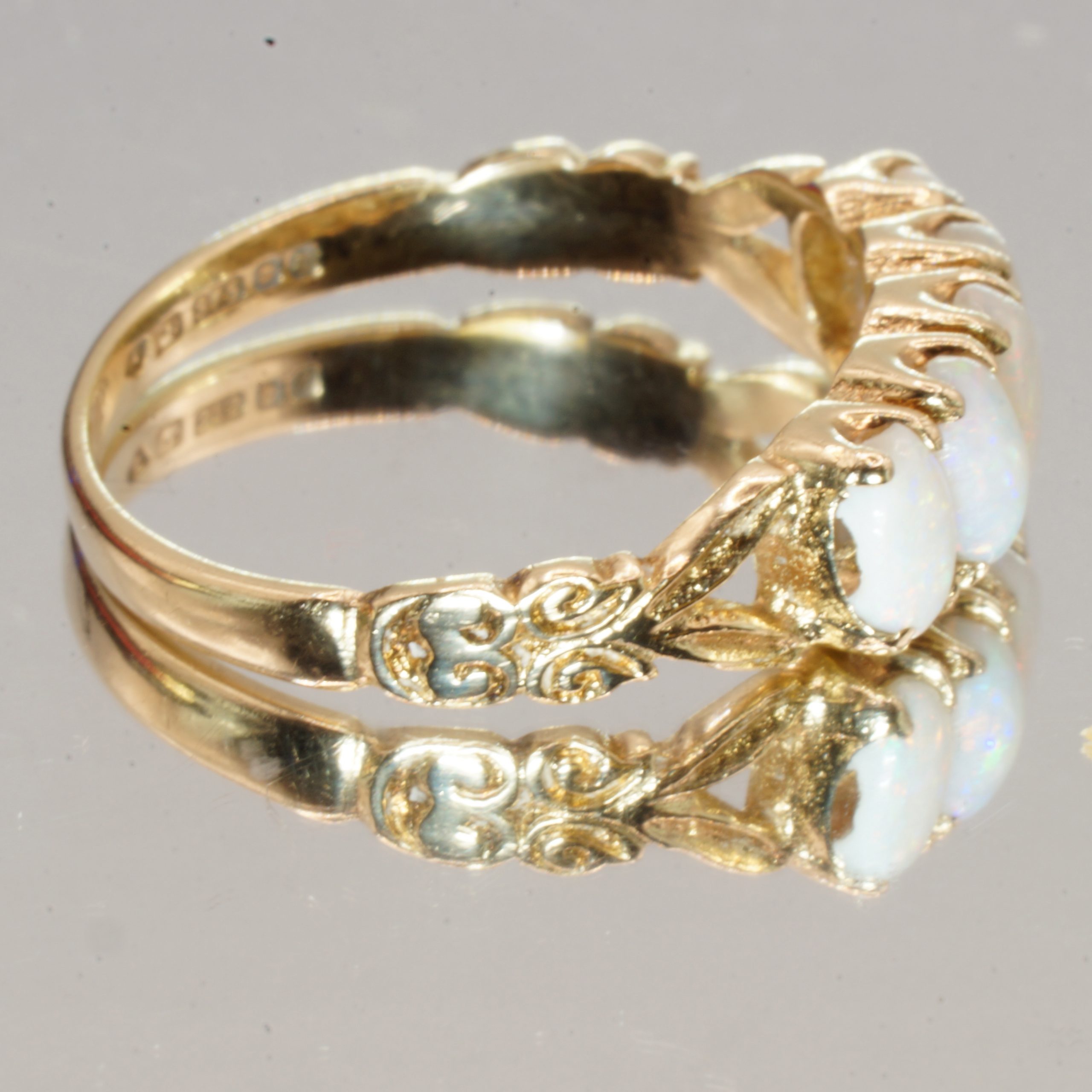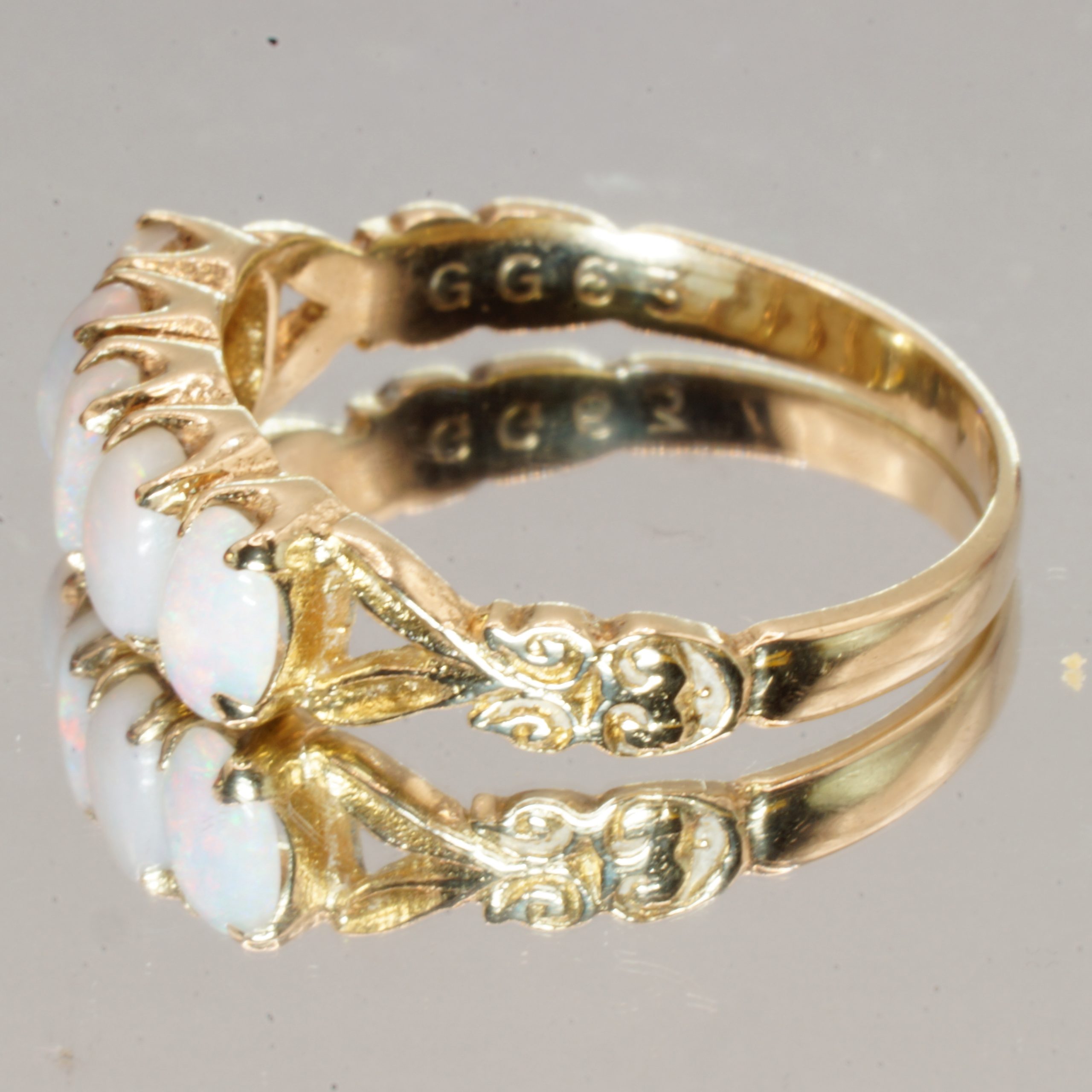 Discover the timeless elegance of this exquisite 9ct yellow gold ring, featuring five stunning opals that radiate a captivating play of colour. This pre-owned, pre-loved piece is hallmarked for authenticity, making it a perfect gift for someone special or a delightful addition to your own jewellery collection. Ideal for stacking or wearing solo, it comes beautifully presented in a luxurious velvet box, ready to impress. With a UK size of M1/2, this ring is a charming choice for any occasion.