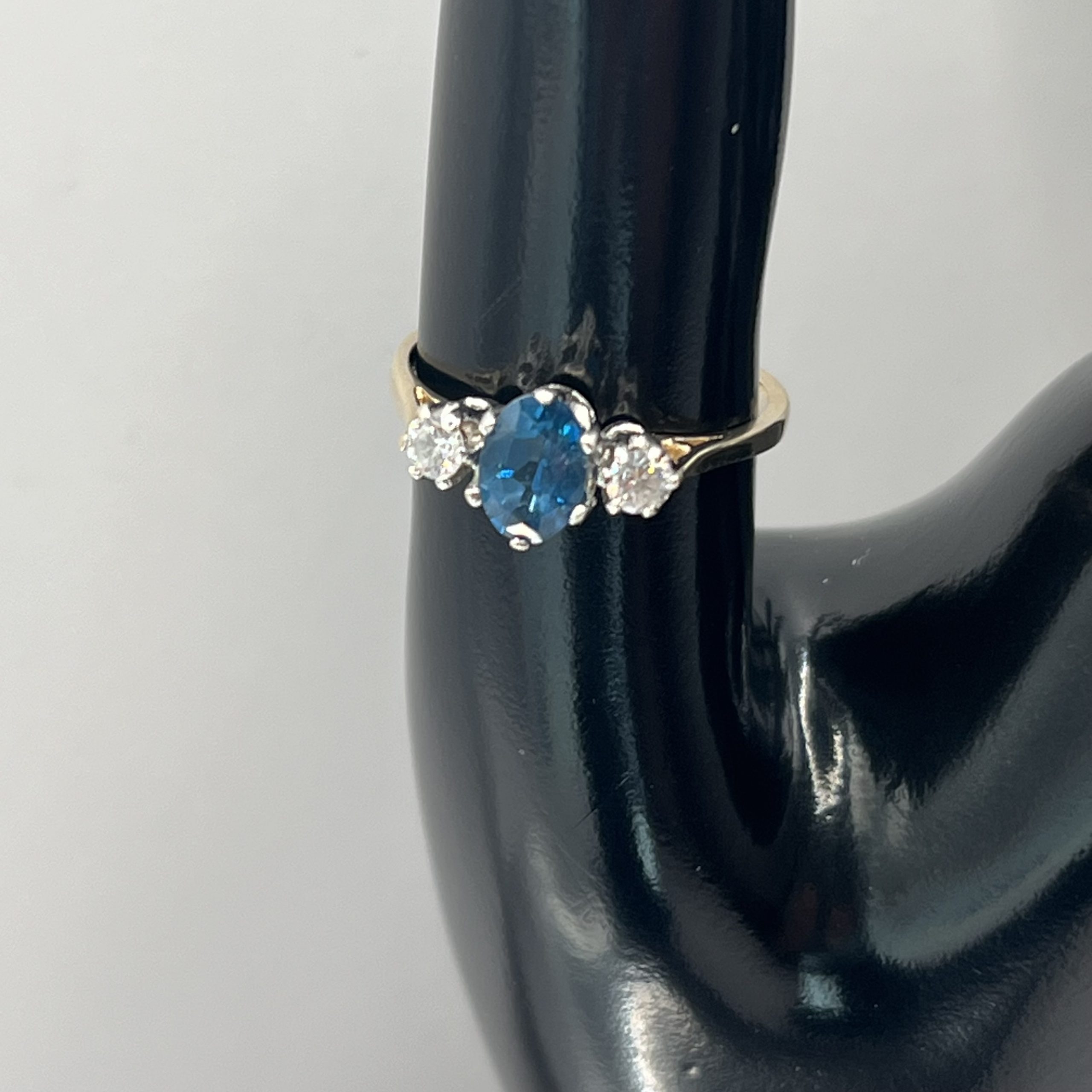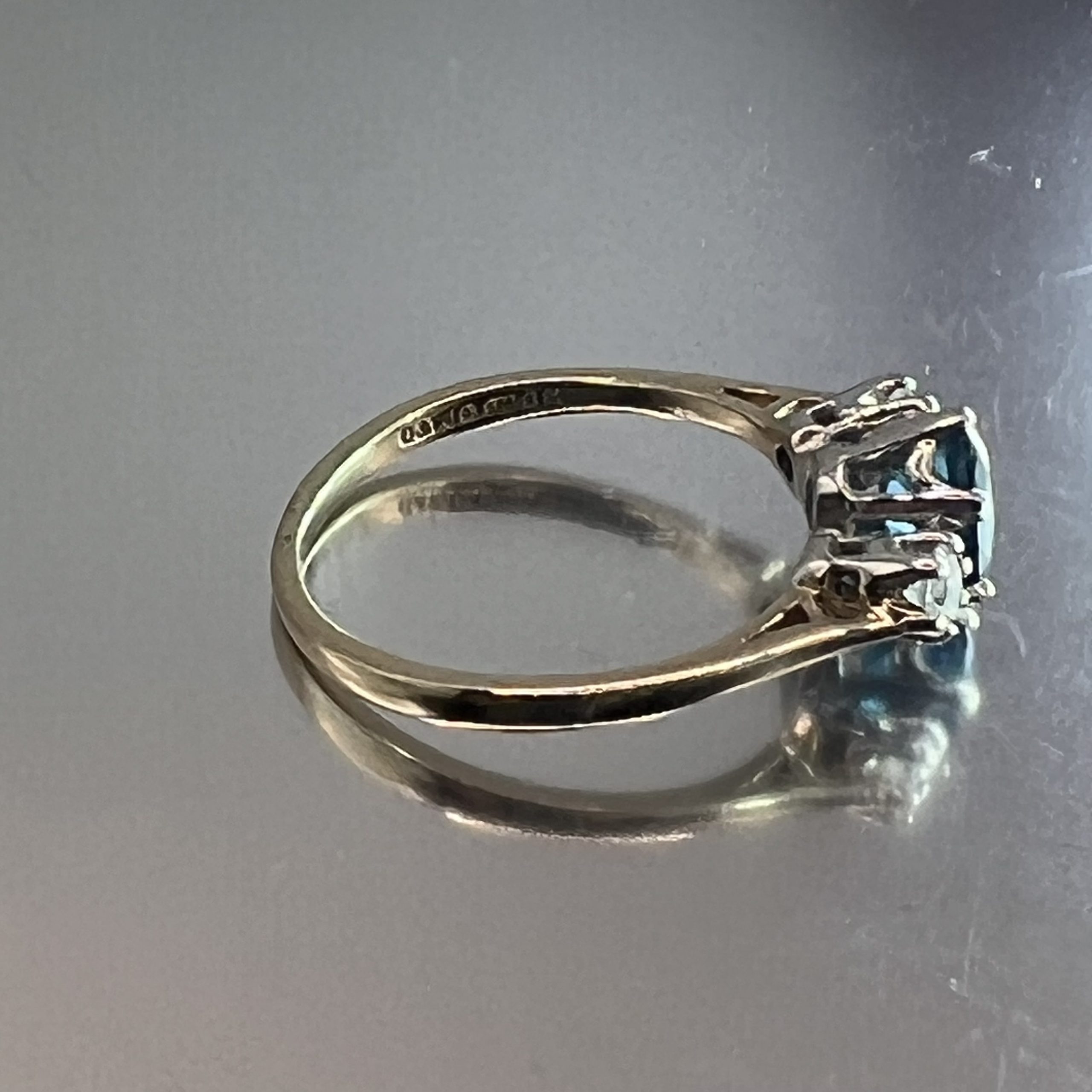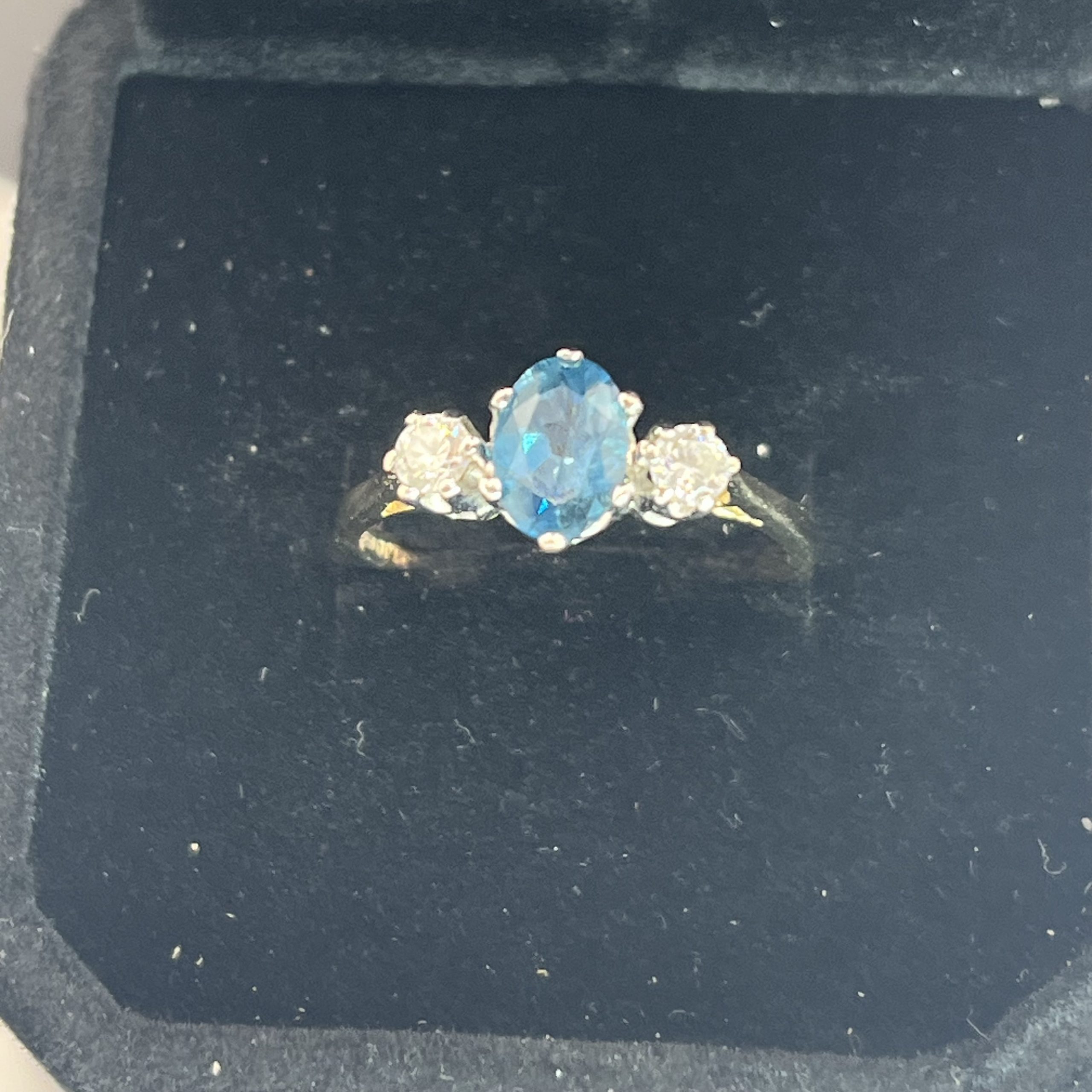 9ct Yellow Gold Blue Topaz Trilogy Ring Hallmark UK Size 0 Pre Owned